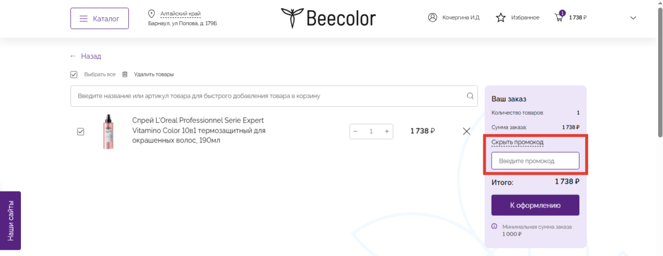 При оформлении заказа введите полученный промокод в окно «Ввести промокод», система автоматически применит скидку в размере 500₽ к вашему заказу.