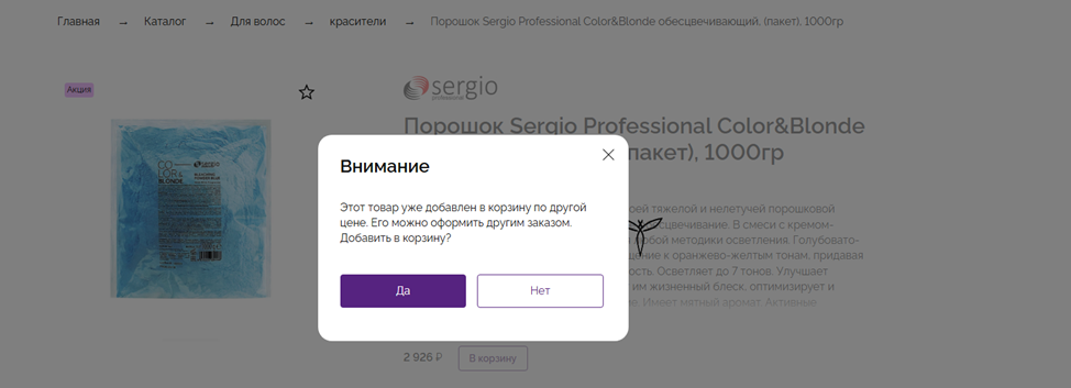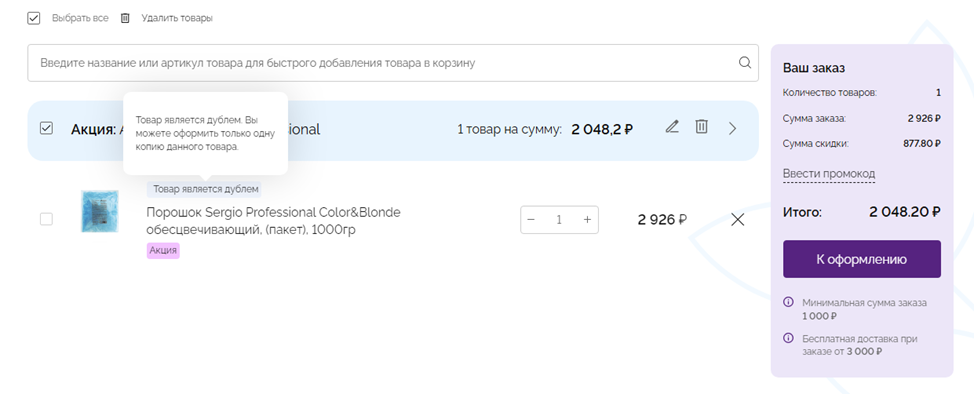 Товары-дубли – товары, которые добавлены в корзину из акции и из каталога.
